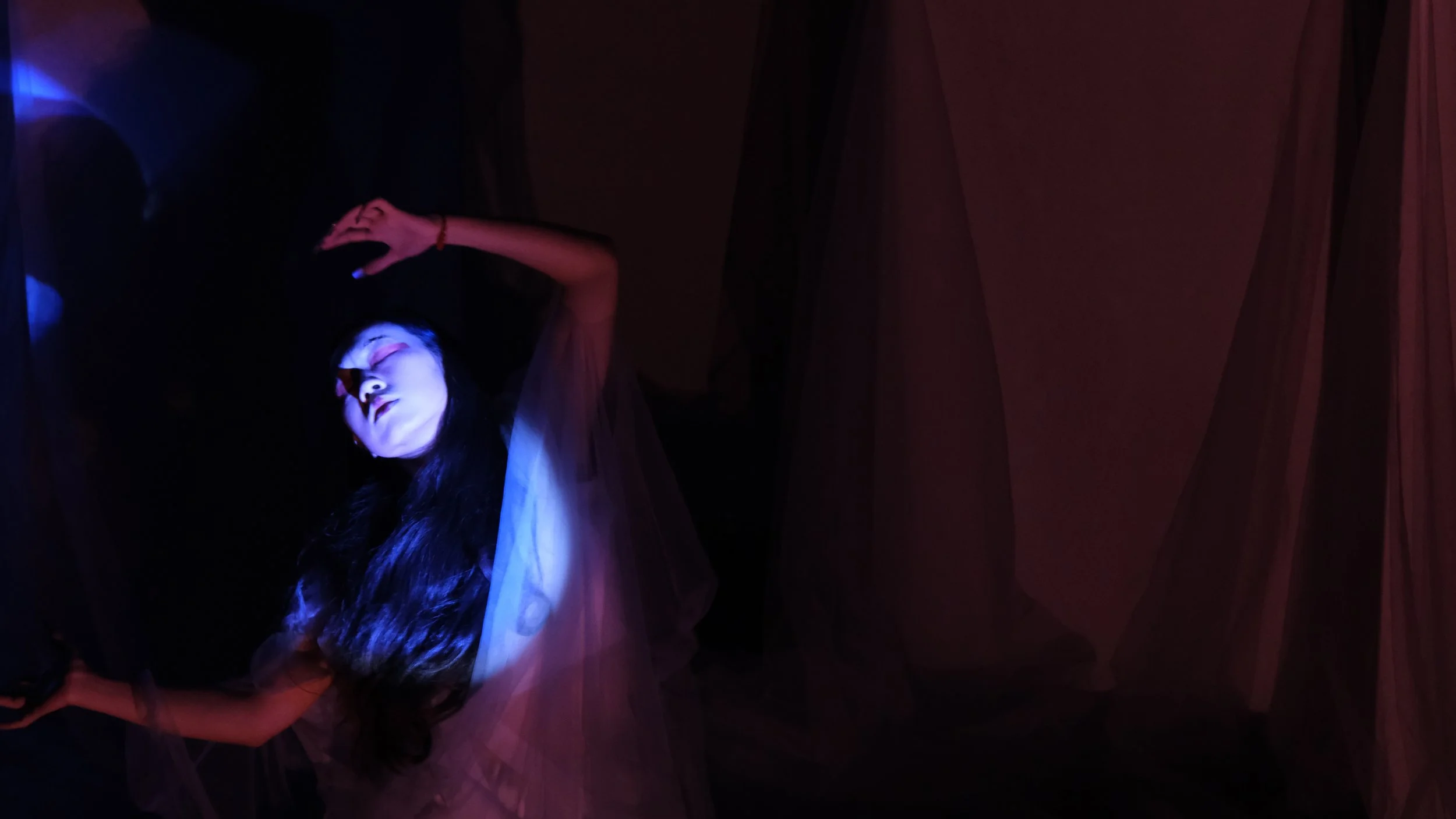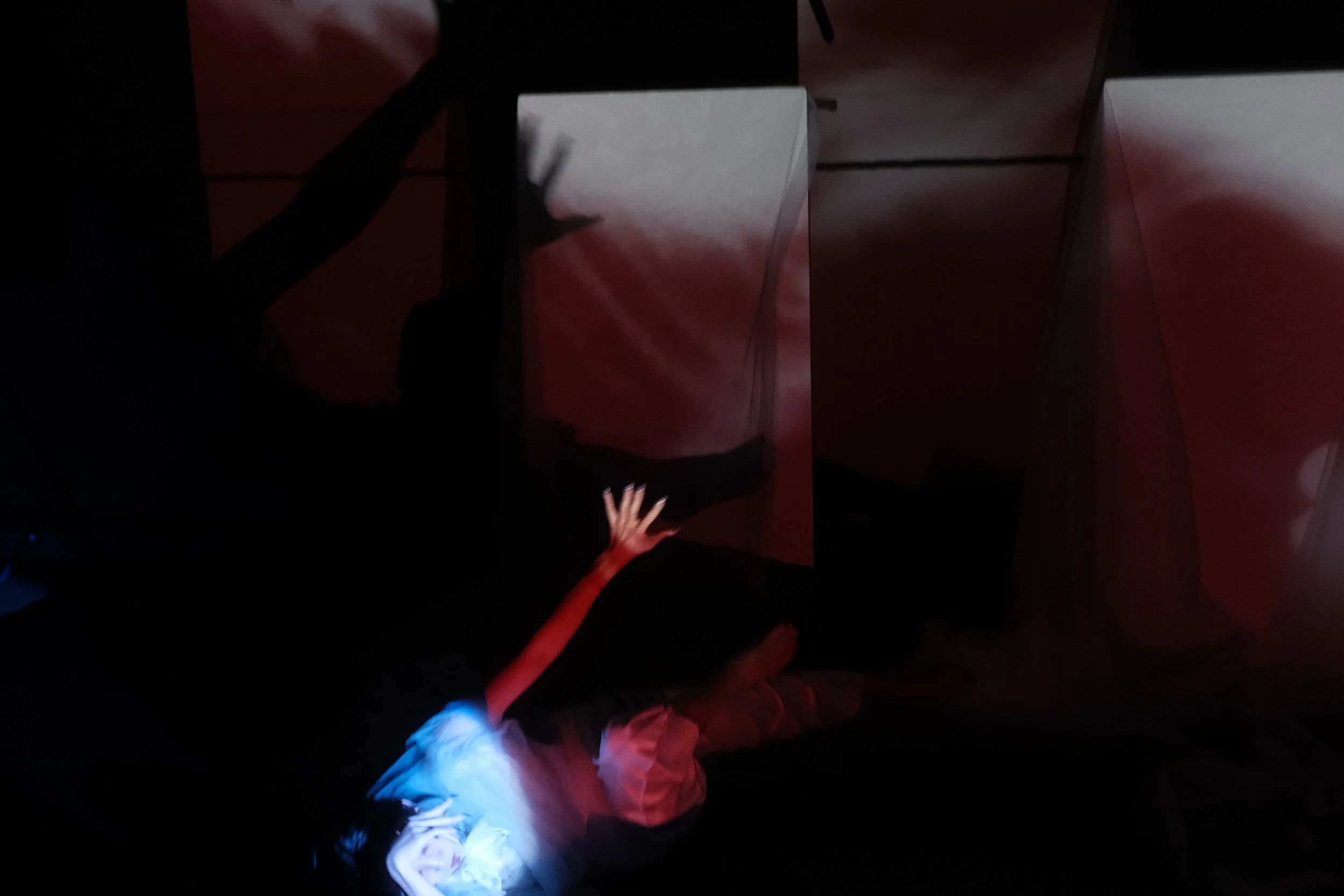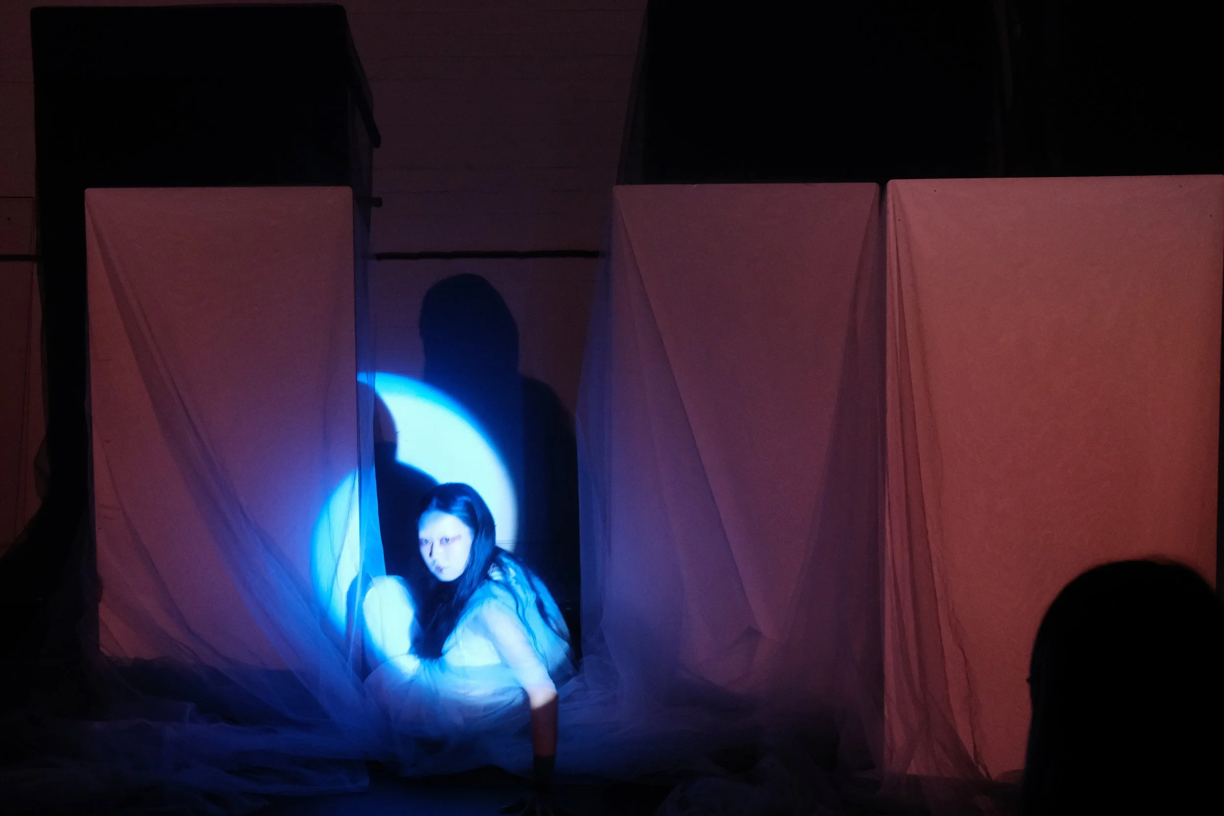 Taking on folk horror and mythical elements, these were combined to retell a story centered around femininity, trauma, and catharsis through movement and spatial storytelling. Spatial design was contrasted with the projection of a film that revealed mental and emotional states of the Woman.